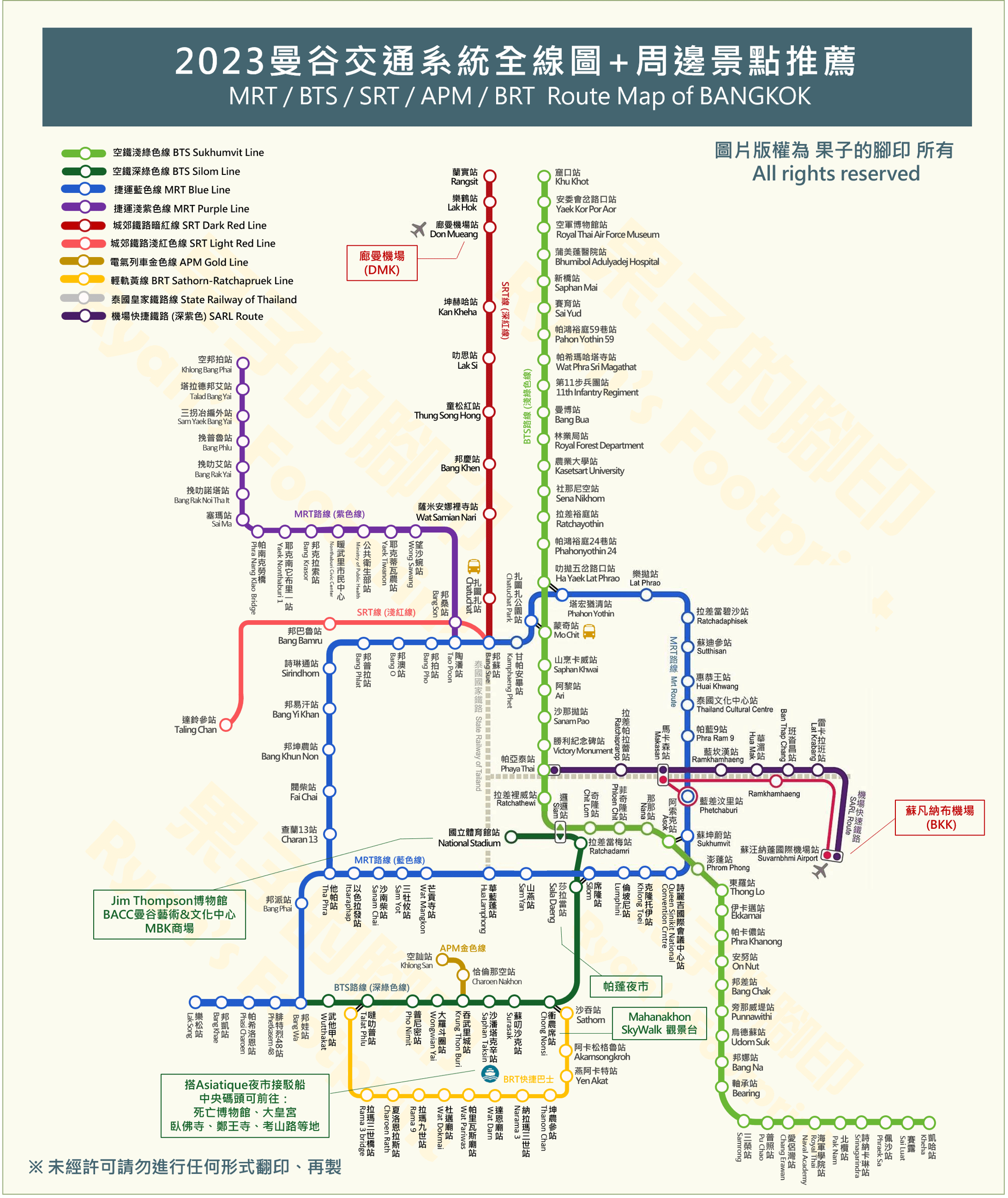 感謝果子的腳印博主提供一看就懂的中英文曼谷交通系統全線圖,匯聚了 BTS、MRT、機場快線等等的路線,超級貼心!